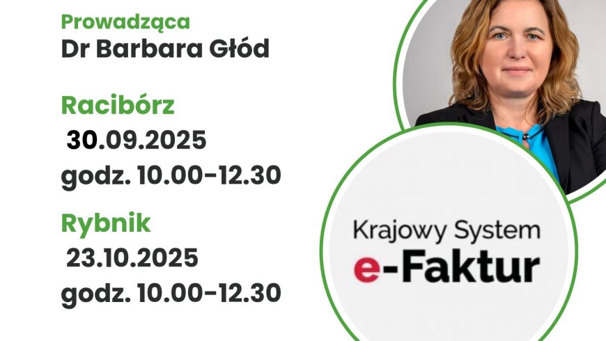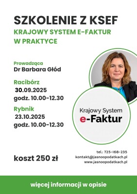 Zapraszam na szkolenie stacjonarne w Rybniku 23 października 2025 roku, w godzinach od 10 do 12.30. Szkolenie dotyczy KSeF, czyli Krajowego Systemu e-Faktur.